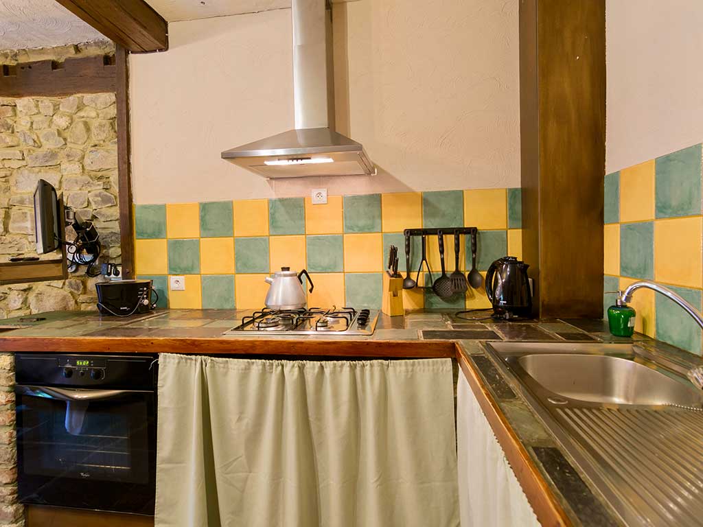 - Cuisine avec cuisinière à gaz, micro-ondes, four électrique et cafetière.